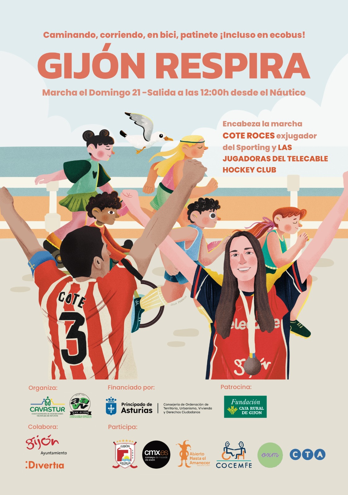 Y el domingo a las 12h será la Marcha «Gijón Respira» encabezada por Cote Roces el exjugador del Sporting de Gijón y las Jugadoras del Telecable Hockey Club. Un recorrido de 5 kilómetros que podrá realizarse caminando, corriendo, en bici o patinete. Para conseguir el dorsal habrá que inscribirse en el formulario, llamando al 985 16 56 38 o pasando por nuestra sede en la Calle Ruta del Alba 9, Gijón.