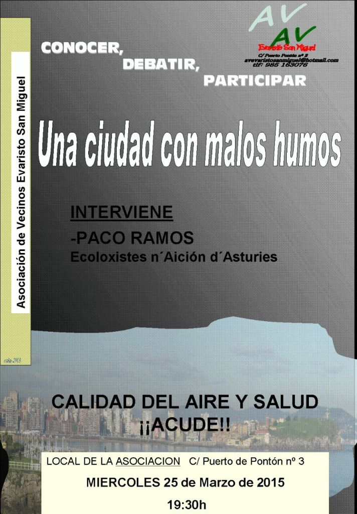 Será a las 19:00 horas, en la Asociación de Vecinos de Evaristo San Miguel, enmarcada dentro de las actuaciones de concienciación de la Plataforma contra la contaminación ambiental de Gijón bajo el título: Una Ciudad con Malos Humos.