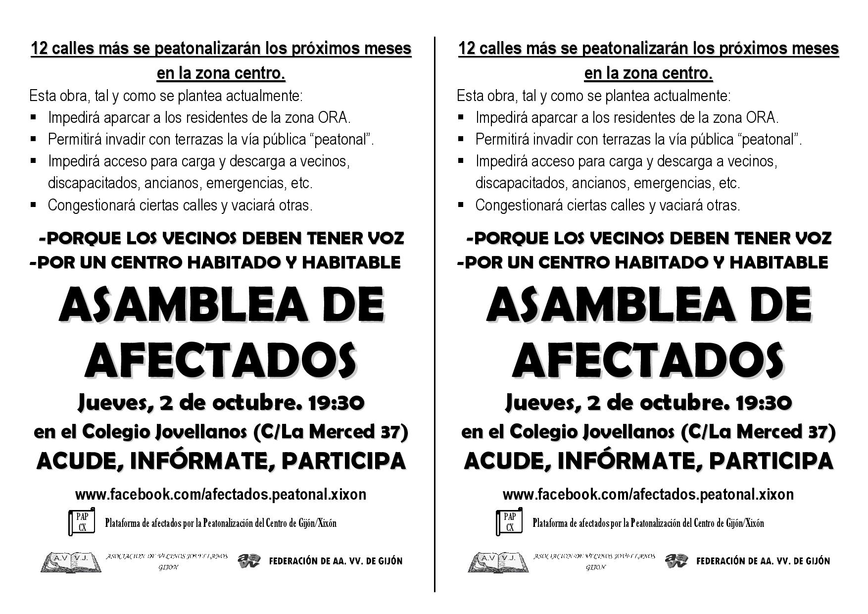 El próximo jueves día 2 de octubre, a las 19:30 horas, en el salón de actos del Colegio Público Jovellanos, tendrá lugar una asamblea abierta a todos los vecinos y vecinas para informar de la peatonalización de 12 calles más en el centro sin haber consultado a los afectados y con consecuencias, a priori, no