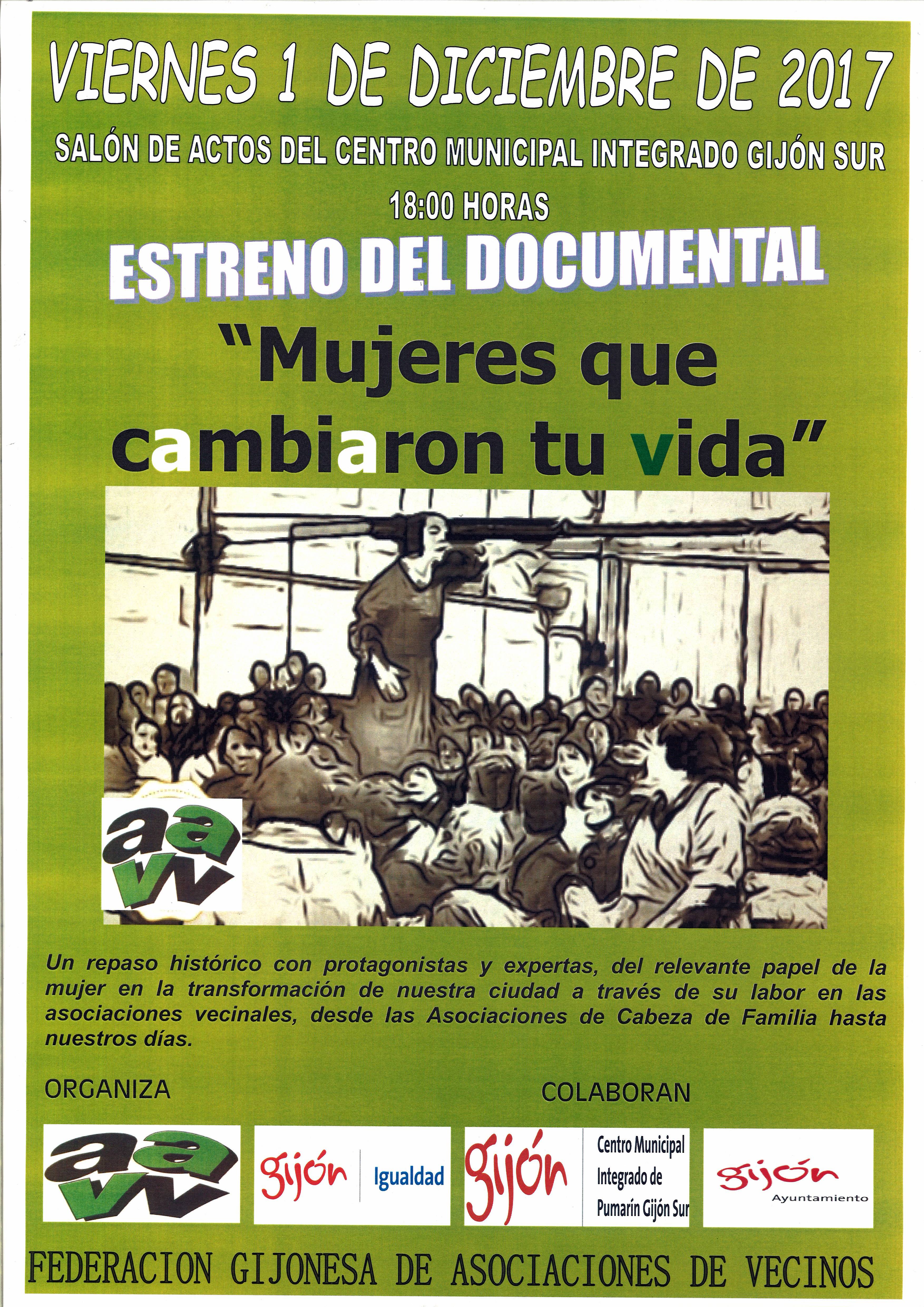 El pasado 1 de diciembre de 2017, con una afluencia de casi 200 personas, se proyectó, dentro de los actos del 40 aniversario de la Legalización de las AAVV, el documental, producido por la FAV, y con la colaboración económica de la Oficina de Políticas de Igualdad del Ayuntamiento de Gijón, Mujeres que Cambiaron tu Vida. El