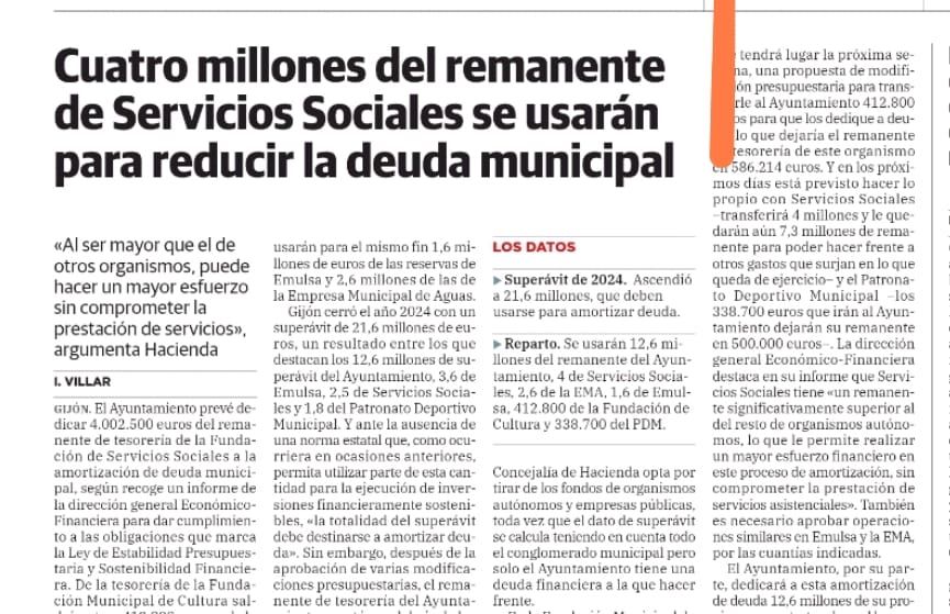 En Gijón parece que urge más amortizar deuda que atender las necesidades sociales de esta ciudad. Es vergonzoso, por ejemplo, que Asuntos Sociales tenga 12 millones de remanente -«la hucha»- mientras hay centenares o miles de gijoneses esperando por ayudas tan necesarias para vivir con dignidad. Y más vergonzoso es que esos 4 millones salgan