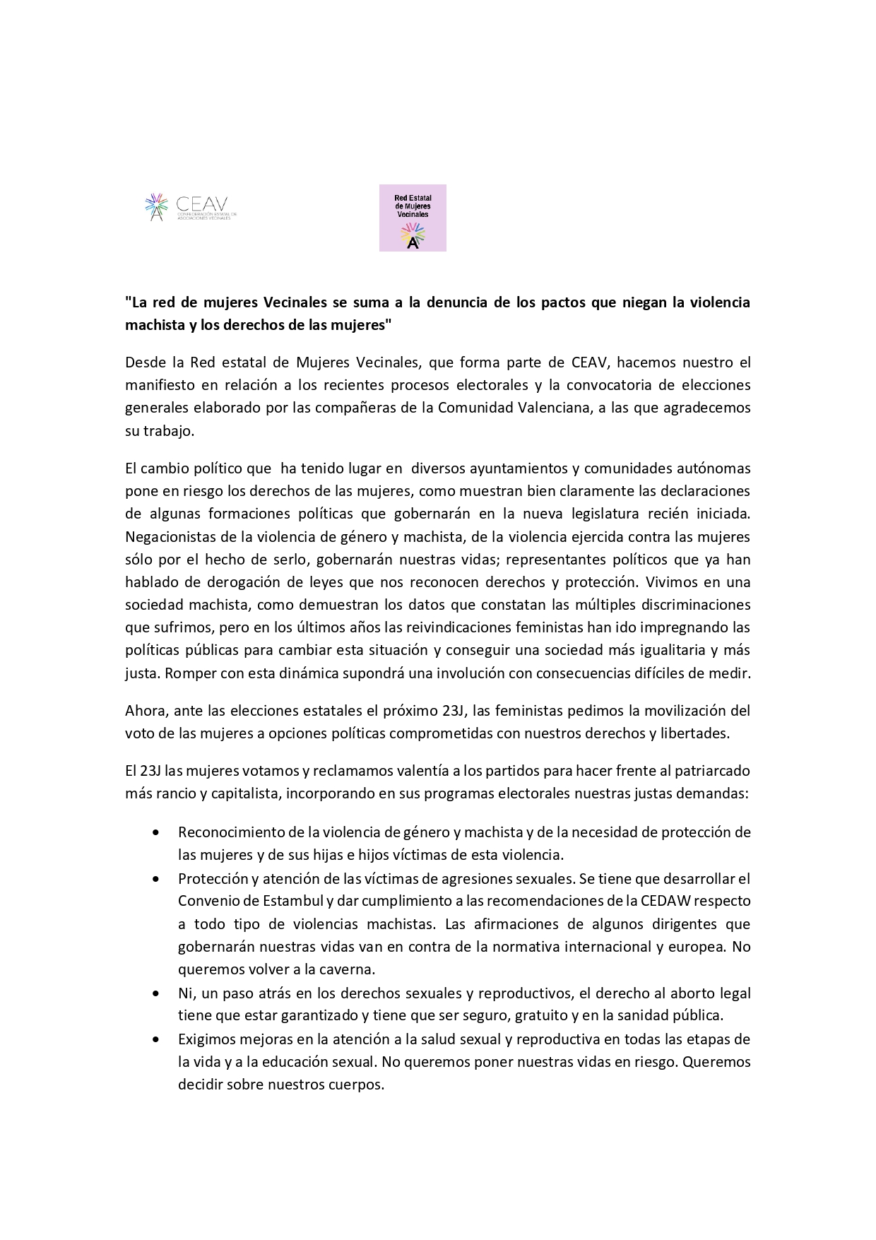 Desde la Red estatal de Mujeres Vecinales, que forma parte de CEAV- de la que es responsable nuestra Vicepresidenta, María José Cuervo García- hacemos nuestro el manifiesto en relación a los recientes procesos electorales y la convocatoria de elecciones generales elaborado por las compañeras de la Comunidad Valenciana, a las que agradecemos su trabajo. El