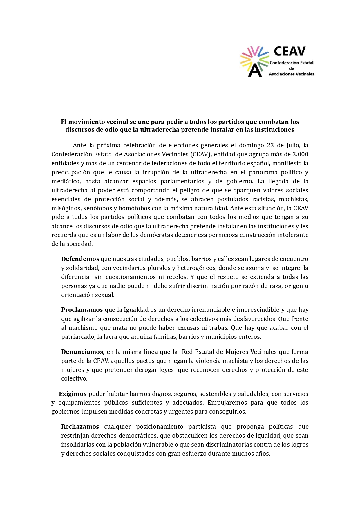 El movimiento vecinal ha promovido históricamente la convivencia vecinal de todas las personas con independencia de su sesgo ideológico, por eso no podemos ni debemos pasar por alto proclamas y actitudes que quiebran la paz vecinal y hacen más difícil la labor que desarrollamos. Los barrios de nuestro país han se han enriquecido en la