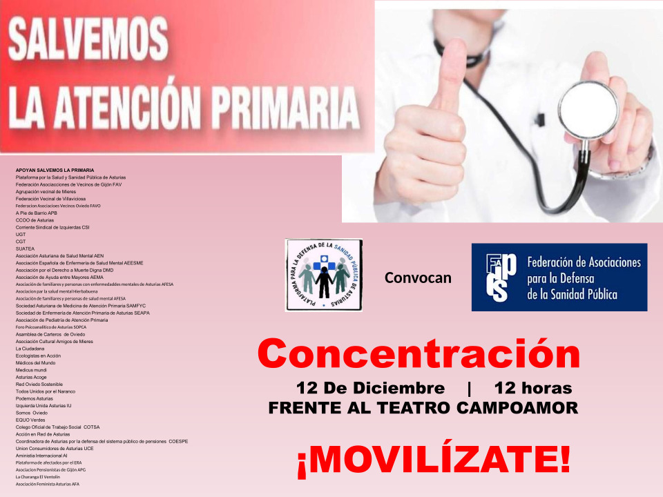 La federación fletó un autobús desde Gijón para arropar la concentración que bajo el lema «Salvemos la Atención Primaria» tuvo lugar en Oviedo el pasado día 12 de diciembre. Nuestro presidente Manuel Cañete intervino en la reivindicación y una vez más recordó quie darle la vuelta a la situación de deterioro que sufre la Atención