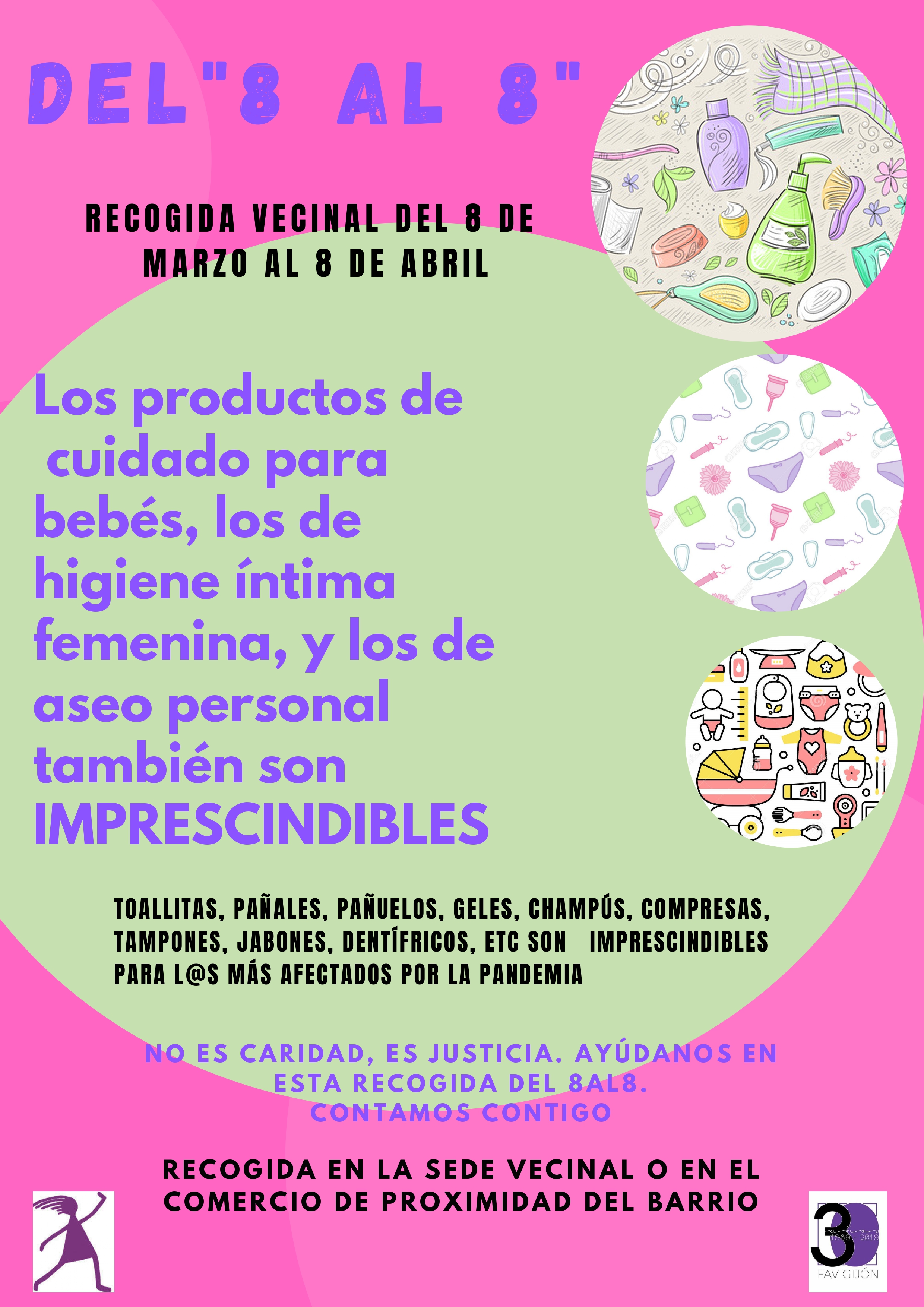 Este 8 de abril finalizó oficialmente la campaña de recogida de productos de higiene personal, higiene específica para mujeres, bebés y ancianos, ideada por la Vocalía de la Mujer de la FAV bajo el lema «del 8 al 8». Esta campaña quería concienciar a los vecinos y vecinas de la importancia de donar este tipo