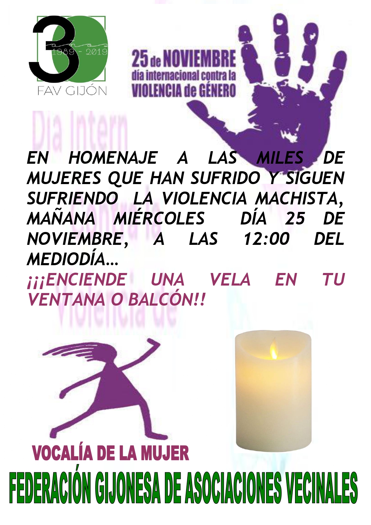 La Federación Gijonesa de Asociaciones Vecinales, a través de su Vocalía de la Mujer, quiere pedir, a los vecinos y vecinas de Gijón, que, mañana miércoles 25 de noviembre, con motivo del Día Internacional contra la Violencia de Género, a las 12:00 del Mediodía, salgan a sus ventanas, terrazas o balcones con una vela encendida