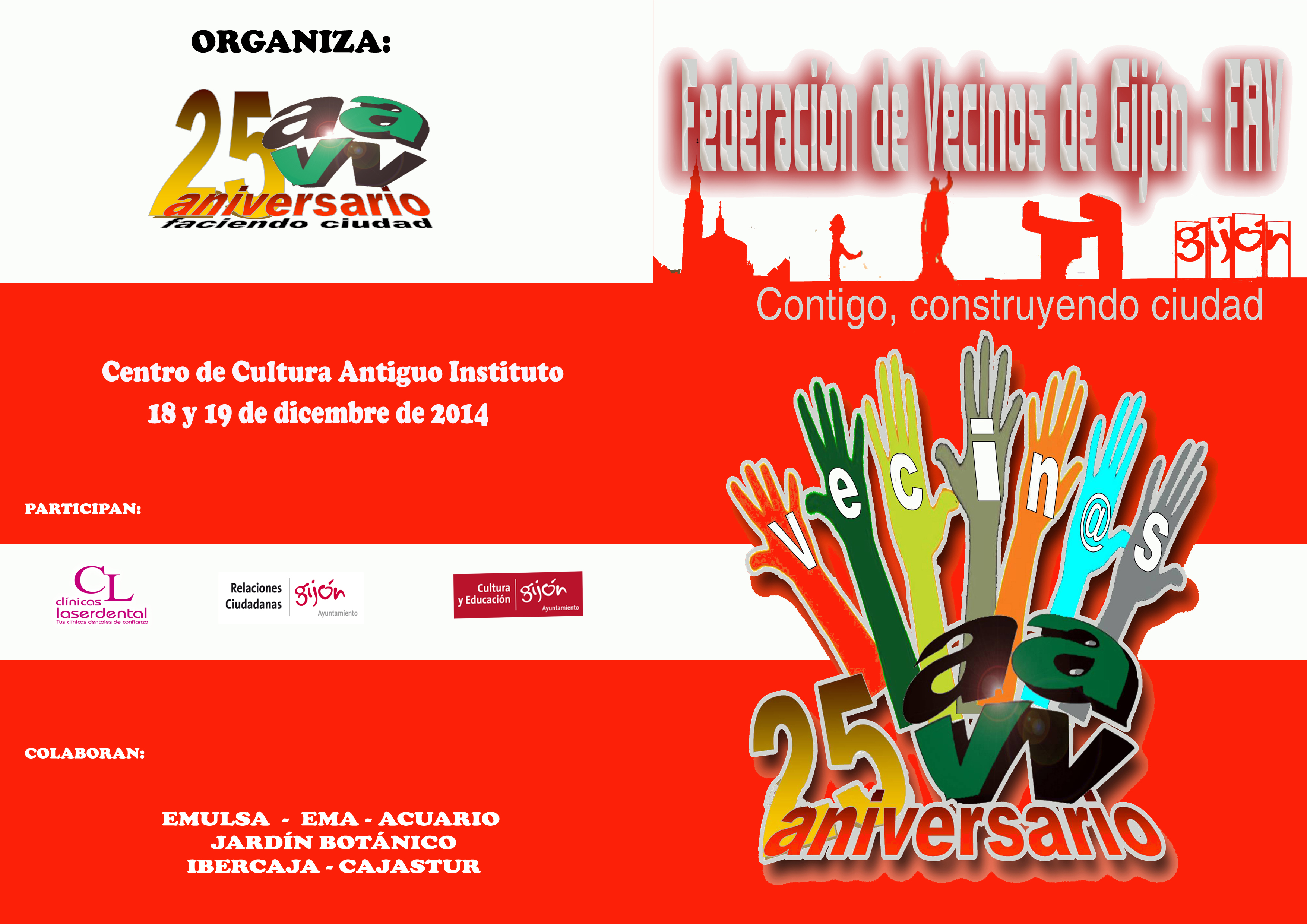PROGRAMA XXV ANIVERSARIO DE LA FAV GIJÓN 18 Y 19 DE DICIEMBRE DE 2014. CENTRO DE CULTURA ANTIGUO INSTITUTO. JUEVES 18 DE DICIEMBRE DE 2014. 17:00 HORAS. SALA DE EXPOSICIONES DEL CENTRO DE CULTURA ANTIGUO INSTITUTO SEGUNDA PLANTA INAUGURACIÓN DE LA EXPOSICIÓN “25 AÑOS CONSTRUYENDO CIUDAD” 17:30 HORAS SALÓN DE ACTOS DEL CENTRO DE CULTURA