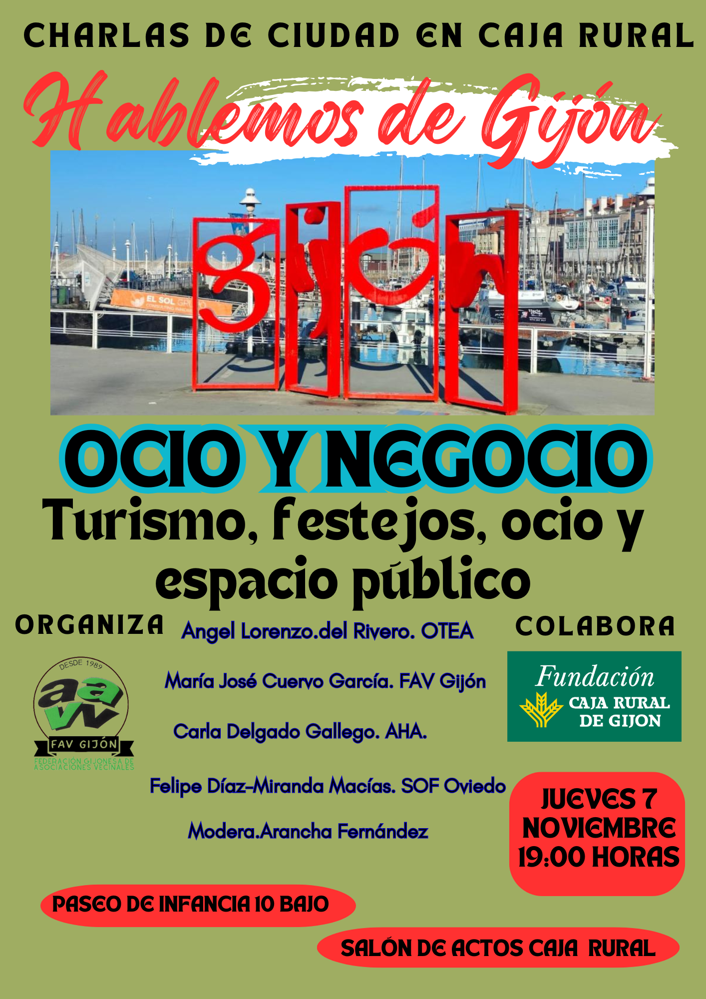 Este jueves 7 de noviembre de 2024, a las 19:00 horas, comienza la primera conferencia del Ciclo de Charlas de Ciudad en Caja Rural con el título Ocio y Negocio. Turismo, festejos , ocio y espacio público. En ella intervendrán Ángel Lorenzo conocido hostelero gijonés y miembro de OTEA, Carla Delgado Gallego, joven presidenta de