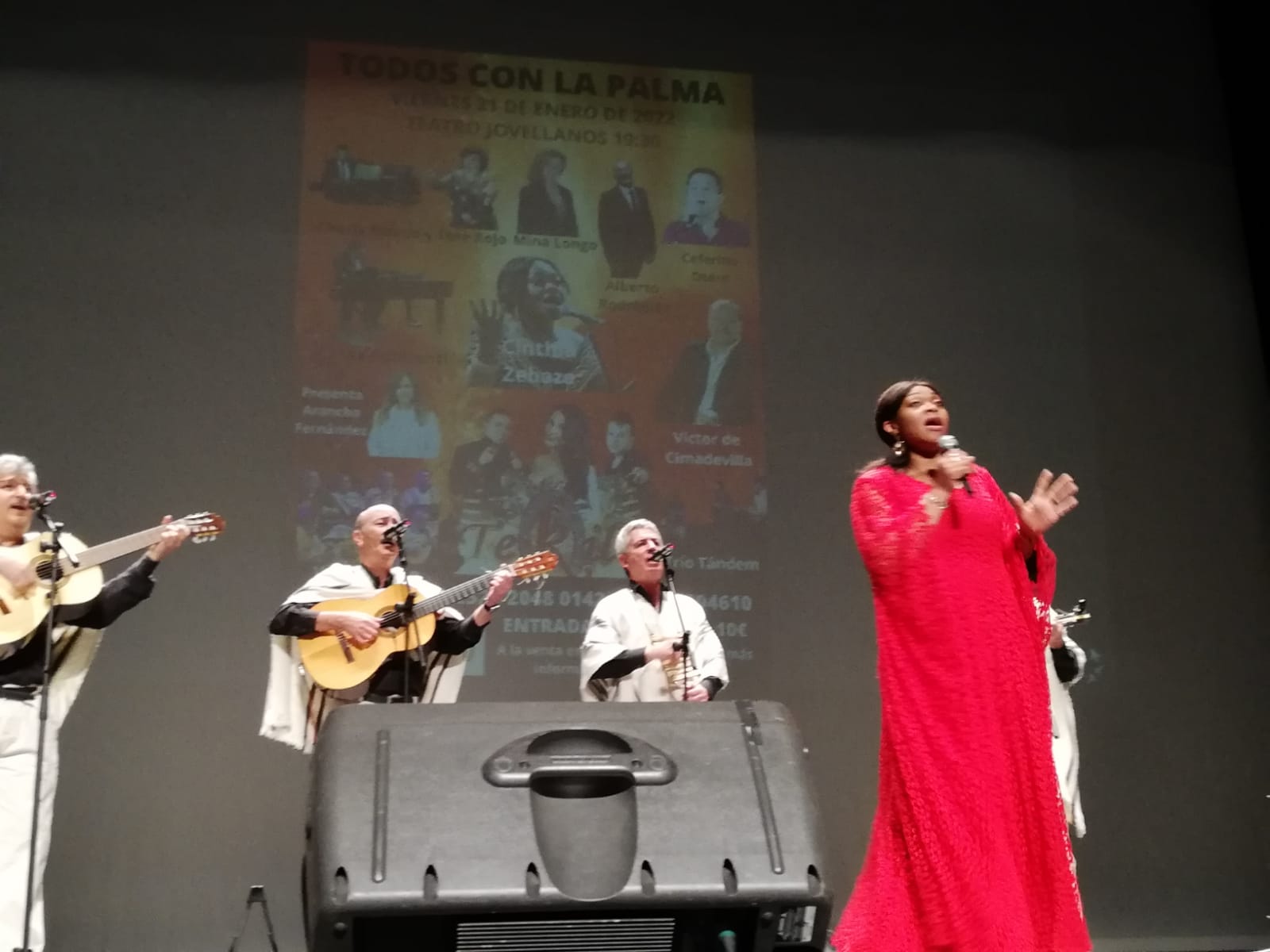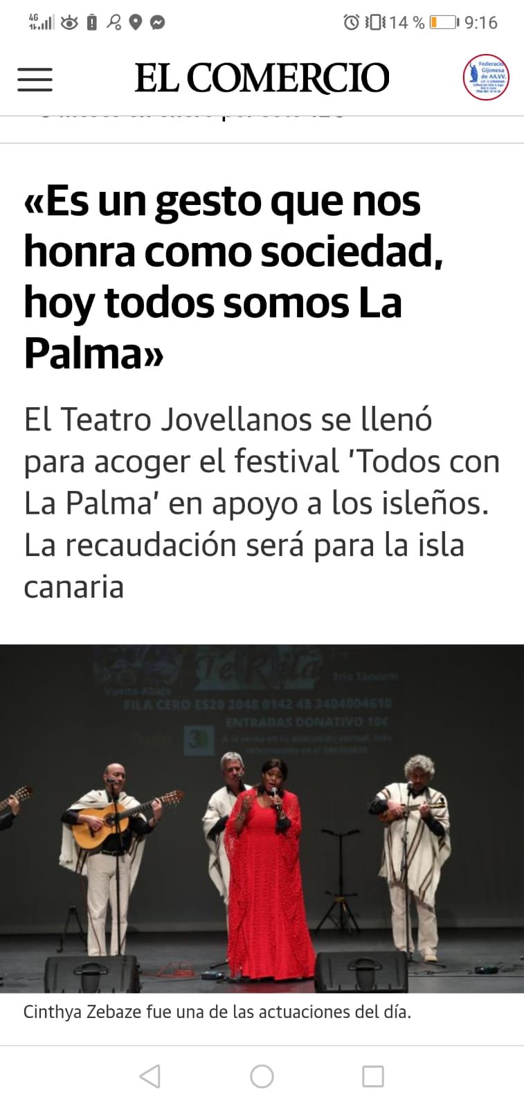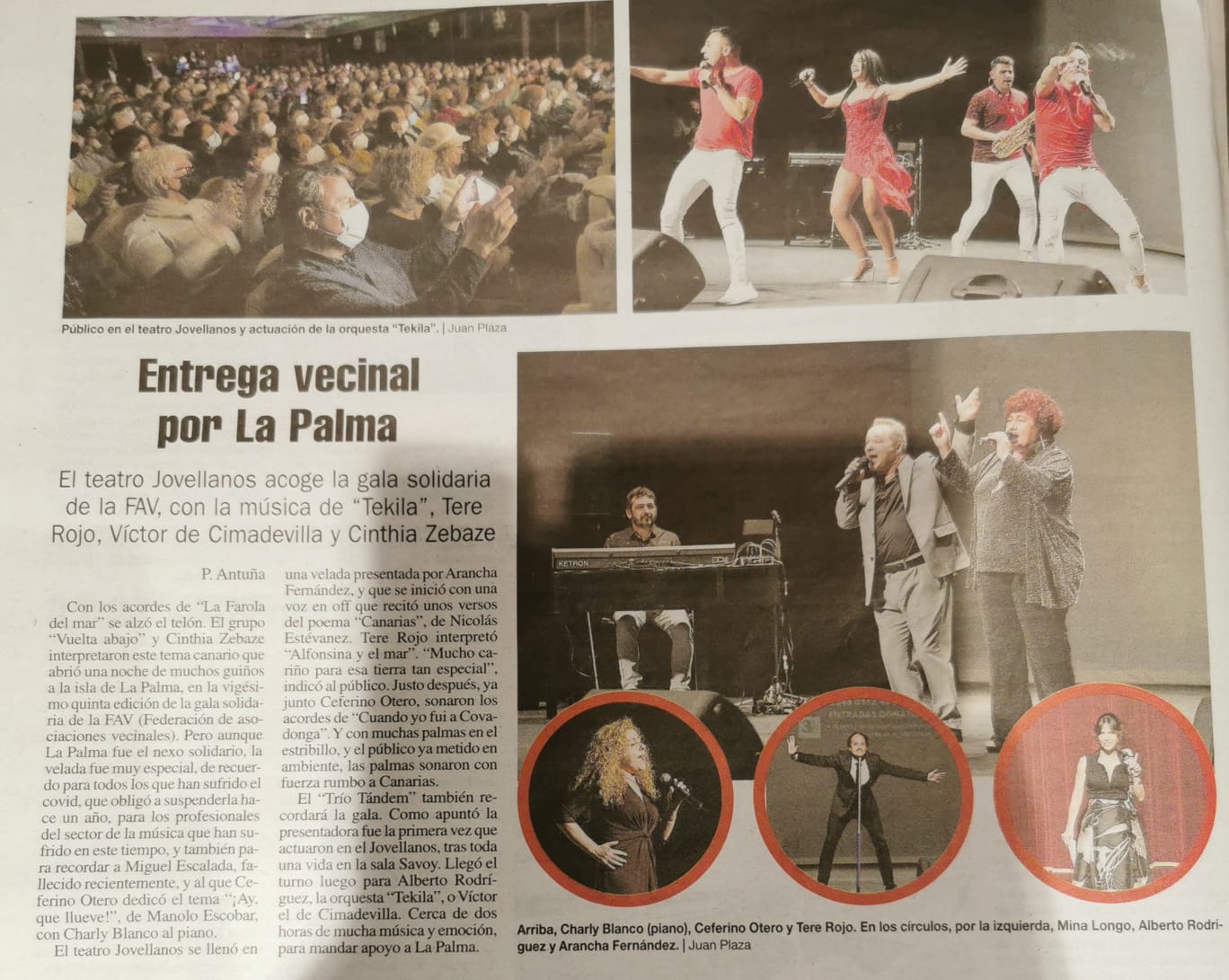 Era el acto estrella de la campaña Todos con La Palma, y el festival solidario del pasado viernes 21 en el Teatro Jovellanos en favor de los afectados por el volcán no defraudó. César Formentí, Cintya Zebaze, Charlie Blanco, Tere Rojo, Ceferino Otero, el Trío Tándem, Alberto Rodríguez, Mina Longo, el Grupo Tekila, Vuelta Abajo y Víctor de Cimadevilla fueron los artistas artífices de un espectáculo de altura que matuvo entrerenidos durante más de dos horas al millar de personas que llenaban el Teatro.. Desde aquí aprovechamos para darle sde nuevo las gracias a todos y cada uno de ellos. A Arancha Fernández por conducir con maestría este espectáculo de variedades. A los Técnicos del Teatro por su entrega incansable, a los medios de comunicación por su eco, y en especial a Radio Enol por su retransmisión en directo, a la alcaldesa y a los representantes de todos los grupos municipales del consistorio gijonés por su presencia institucional, a los colaboradores Otea, Unión de Comerciantes, Hostelería con Conciencia y Asturias Suma, y a toda la sociedad civil que, bien a través de sus entidades más emblemáticas, bien a través del vecino/a de a pie han contribuido con sus aportaciones a recaudar cerca de 25.000 euros que, sin ninguna duda, servirán para paliar la situación de algunas familias que lo están pasando por los efectos devastadores del volcán. Las asociaciones que componen la federación vecinal han demostrado una vez más del poderío del movimiento vecinal de Gijón, y la soidaridad del pueblo de Gijón.