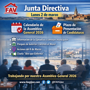 El próximo lunes 2 de marzo la Federación de Asociaciones Vecinales de Gijón celebrará reunión de su Junta Directiva, en la que se abordarán diversos asuntos de actualidad del movimiento vecinal.