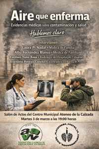 Te invitamos a una charla-coloquio abierta a la ciudadanía donde profesionales sanitarios y expertos ambientales analizarán, con datos y sin rodeos, cómo la contaminación influye en enfermedades respiratorias, cardiovasculares y en nuestra calidad de vida.