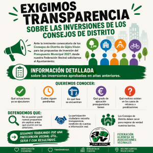 Ante la inminente convocatoria de los Consejos de Distrito de Gij贸n/Xix贸n para las propuestas de inversi贸n del Presupuesto Municipal 2027, desde la Federaci贸n Vecinal solicitamos al Ayuntamiento: