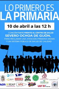 El próximo 10 de abril a las 12:00 h nos concentramos frente al Centro de Salud Severo Ochoa de Gijón para defender lo que es de todas y todos: una sanidad pública digna y de calidad.